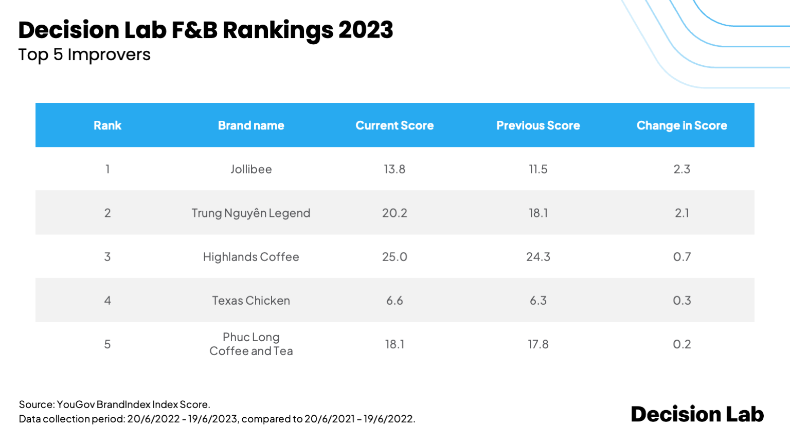 Decision Lab released the five “most improved” brands alongside the overall rankings. The biggest improver this year is Jollibee, which increased by 2.3 points in 2023. In a recent blog, Decision Lab discovered that Jolliebee is KFC’s most significant competitive threat in Vietnam.