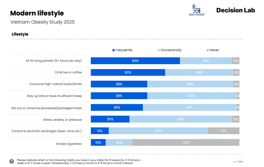 The Vietnam Obesity Study 2025 is a joint initiative by Novo Nordisk and Decision Lab, developed to explore public perceptions, awareness, and attitudes toward obesity in Vietnam. The study integrates quantitative findings from an online survey of 1,004 Vietnamese people across five major cities (Hanoi, Ho Chi Minh, Da Nang, Hai Phong, Can Tho), and qualitative insights from in-depth interviews with individuals living with obesity, parents, and healthcare professionals. In addition, it incorporates secondary data from the ACTION-Vietnam, a non-interventional, cross-sectional survey involving 1,000 people with obesity (PwO) and 200 healthcare professionals (HCPs) across Vietnam.