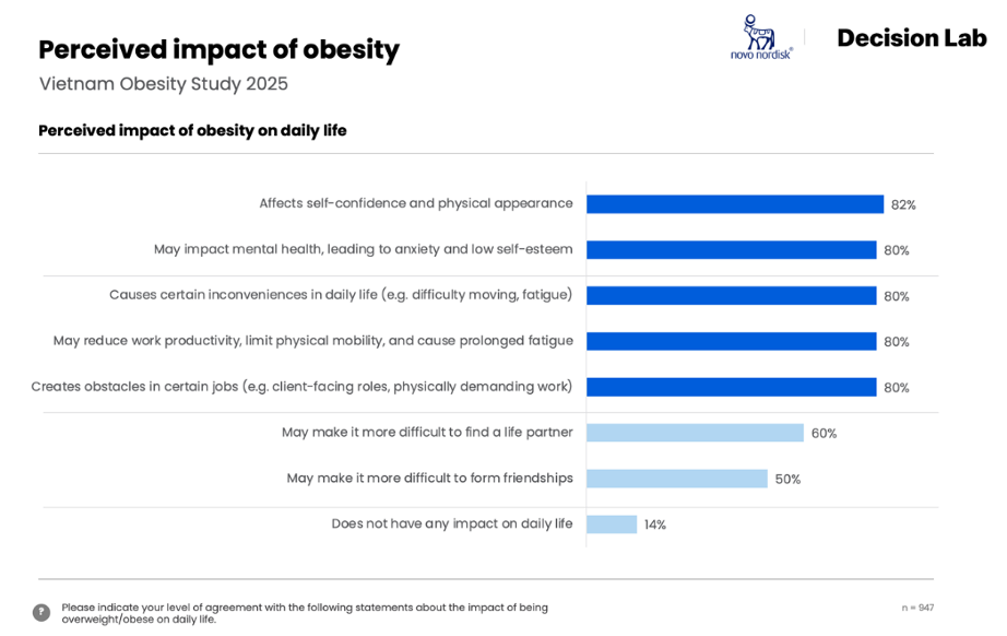 According to the World Obesity Atlas 20251, Vietnam currently has one of the lowest obesity prevalence in Southeast Asia, but it is rising at the fastest pace in the region. A new public report from Novo Nordisk Vietnam, developed in collaboration with Decision Lab, sheds light on how obesity is perceived in Vietnam and why action remains limited despite rising health and economic risks. Based on survey responses from 1,004 Vietnamese people across five major cities and in-depth interviews with patients and healthcare professionals, the report reveals a striking paradox: awareness is high, yet action is lacking. Delayed consequences, ingrained lifestyle habits, and early-life misconceptions contribute to inaction, while stigma and systemic barriers continue to hinder timely prevention and treatment. The report calls on policymakers, healthcare providers, and communicators to bridge the gap between awareness and action - before obesity becomes an entrenched public health and economic crisis in Vietnam.